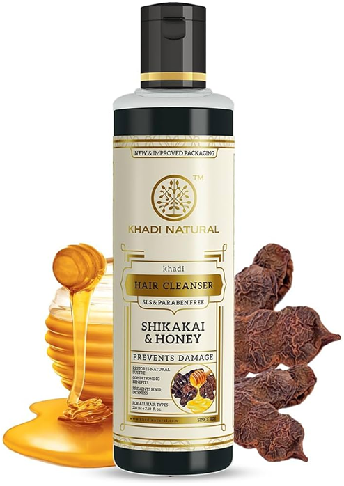 Khadi Natural Shikakai Shampoo: This product gently cleanses the scalp while strengthening roots with herbal extracts. The Shikakai-rich formula helps control hair fall, reduce dandruff, and promote smoother, shinier hair.
